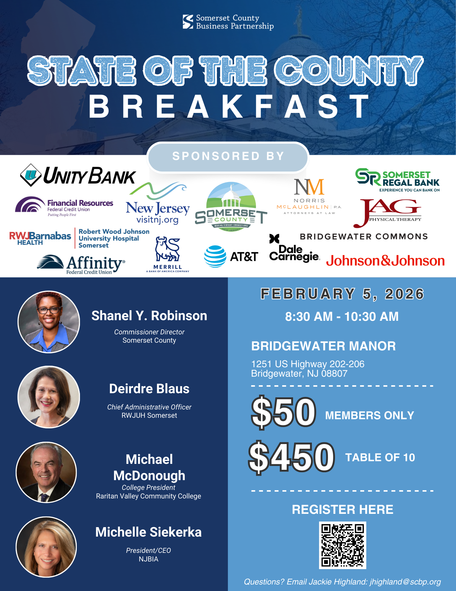 Start your day with insight, connection, and opportunity at the State of the County Breakfast, on February 5th. Join top business leaders, elected officials, and community influencers as we dive into the latest updates on economic growth, infrastructure improvements, and strategic initiatives shaping the future of Somerset County. This is your chance to hear directly from county leadership, gain insider perspectives, and position your business for success in the year ahead.