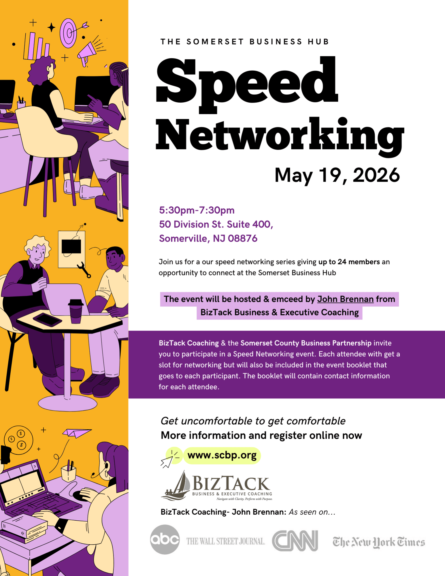 Join us for our Speed Networking series, giving up to 24 members an opportunity to connect at the Somerset Business Hub! Please note, registration closes on Friday, May 15th to allow time for booklet production. After that date, please contact John Brennan directly to inquire about a waiting list. Due to limited space, only one attendee per business, please. Also, please keep in mind that this is a timed event, and prompt arrival is appreciated.