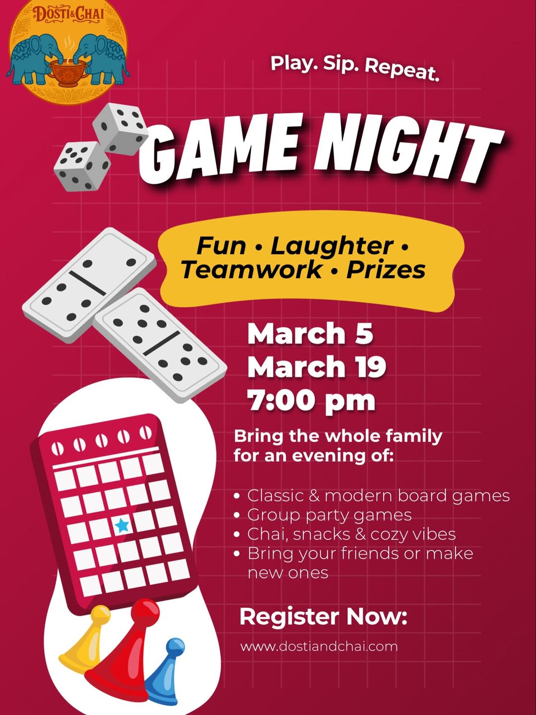 Join us for Game Night at Dosti & Chai for an evening of chai, games, and great company. Whether you’re bringing friends or coming solo, it’s a relaxed and welcoming way to spend the night and meet new people in the community. Your $10 entry includes one cup of chai and access to a variety of games, plus plenty of laughs along the way. It’s the perfect chance to unwind, connect, and enjoy the spirit of dosti, the Hindi word for friendship.