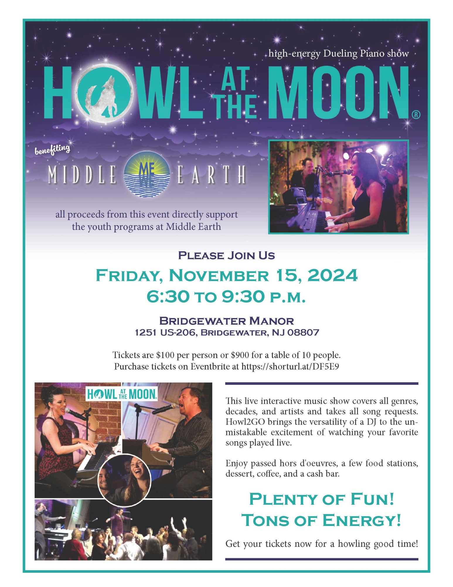 his live interactive music show covers all genres, decades, and artists and takes all song requests. Howl2GO brings the versatility of a DJ to the unmistakable excitement of watching your favorite songs played live. Enjoy passed hors d'oeuvres, a few food stations, dessert, coffee, and a cash bar.