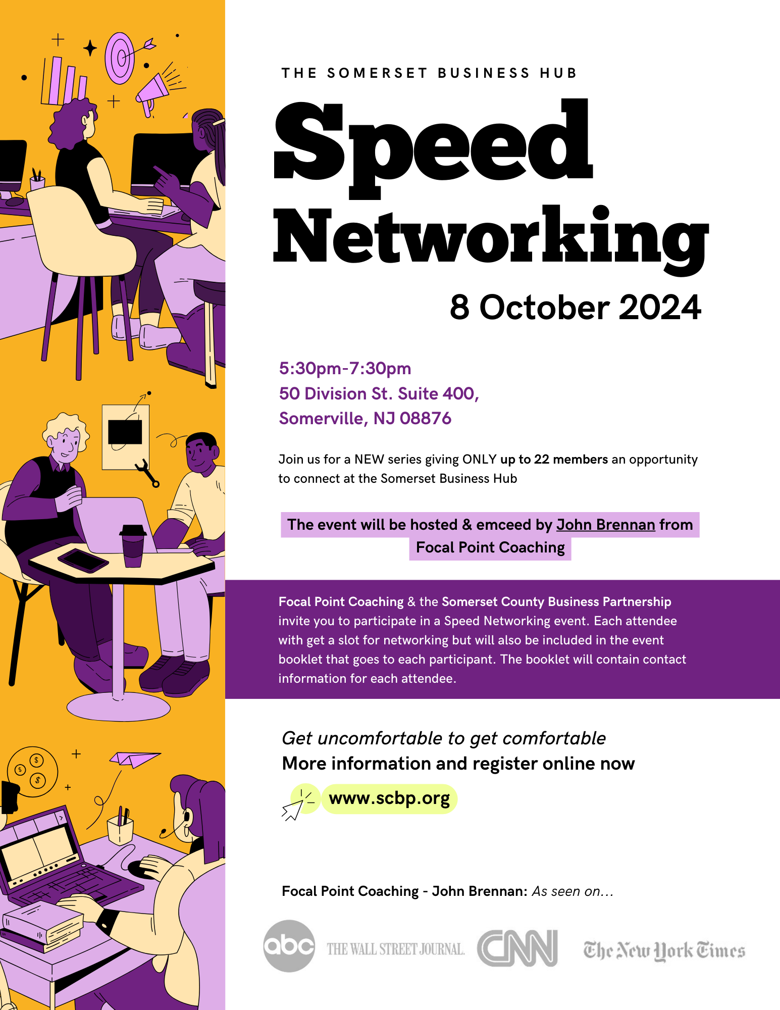 Join us for our speed networking series, giving up to 22 members an opportunity to connect at the Somerset Business Hub. *Please note: Registration closes at 5:00pm on Friday, October 4th to allow time for booklet production. Interested parties after that date, please contact John Brennan at jbrennan@focalpointcoaching.com
