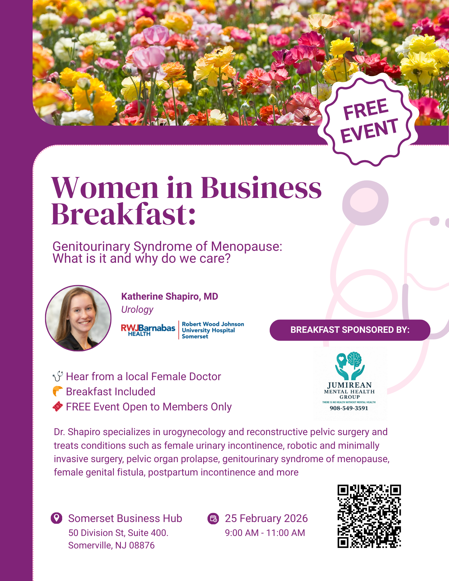 Join us for our first Women in Business event for 2026 with a focus on women's health. Dr. Katherine Shapiro, MD (RWJ University Hospital Somerset) will present on "Genitourinary Syndrome of Menopause: What is it and why do we care?" A light breakfast will be provided.