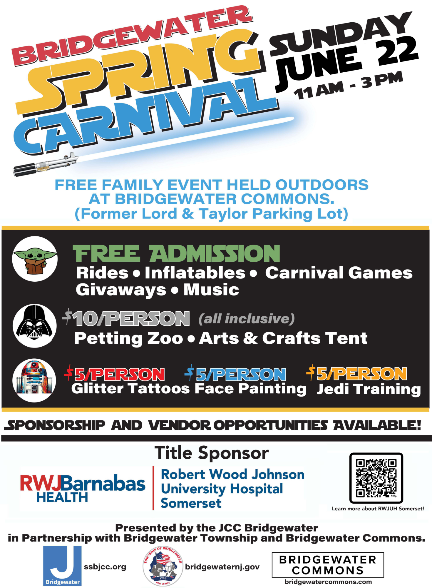 Bridgewater, NJ – The Shimon and Sara Birnbaum Jewish Community Center (JCC), in partnership with Bridgewater Township and Bridgewater Commons, is excited to announce the return of the Bridgewater Spring Carnival on Sunday, June 22, 2025, from 11:00 AM to 3:00 PM at Bridgewater Commons (400 Commons Way, Bridgewater, NJ 08807).