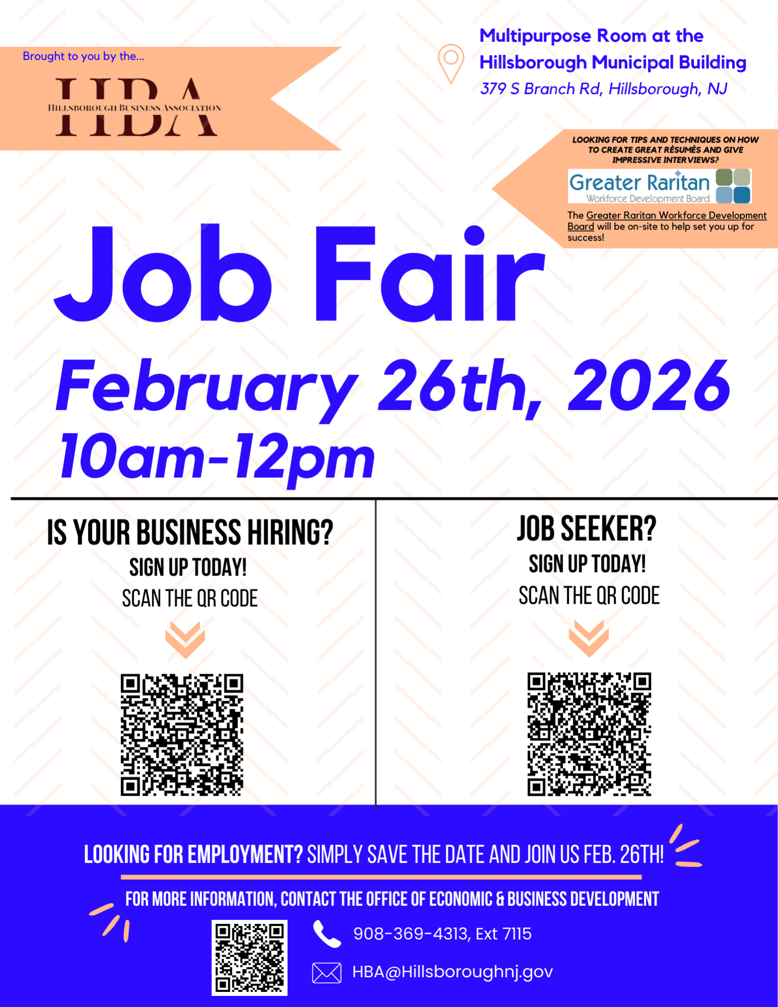 The Office of Economic & Business Development is hosting a Job Fair on Thursday, February 26, 2026, from 10:00 a.m. to 12:00 p.m. at the Hillsborough Municipal Building. The event will connect HBA businesses that are currently hiring with local job seekers in a face-to-face setting. The Greater Raritan Workforce Development Board will also be on-site to provide résumé and interview support.