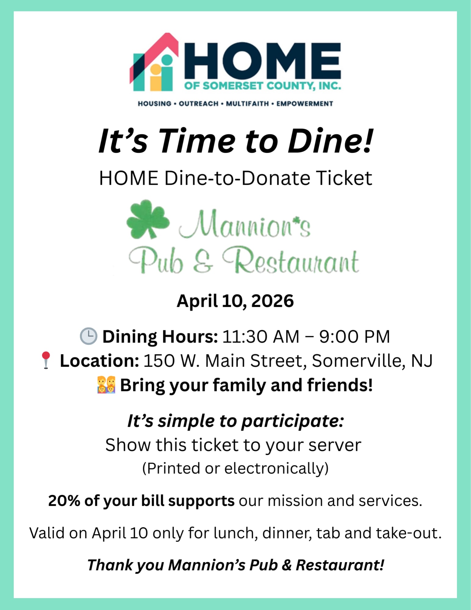 HOME of Somerset County invites the community to dine out for a cause on Friday, April 10, 2026, during a dine-to-donate fundraiser at Mannion’s Pub & Restaurant in Somerville. Mannion’s will donate 20% of all sales from lunch, dinner, bar tabs & take-out to HOME of Somerset County for guests who present the HOME fundraiser certificate. Supporters can participate by dining at Mannion’s anytime throughout the day and presenting the fundraiser certificate, either printed or displayed on a phone. The certificate is available on HOME’s website at Dine to Donate | HOME of Somerset County | NJ. Funds raised will support HOME of Somerset County’s work assisting individuals and families experiencing homelessness and housing instability throughout Somerset County.