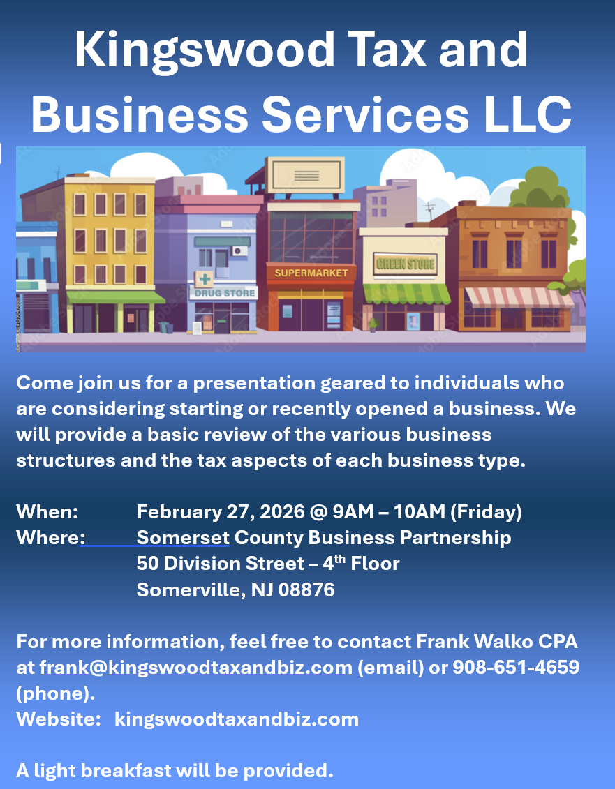 Come join us for a brief presentation on Friday, February 27, 2026 @ 9AM at the Somerset County Business Partnership where we will provide an overview of the most common business types (sole proprietorship, single member LLC, partnerships, Subchapter S Corporations and C Corporations) and how each type is taxed. This presentation is geared toward those individuals who are considering starting a business or have just recently started a business. A light breakfast will be served.