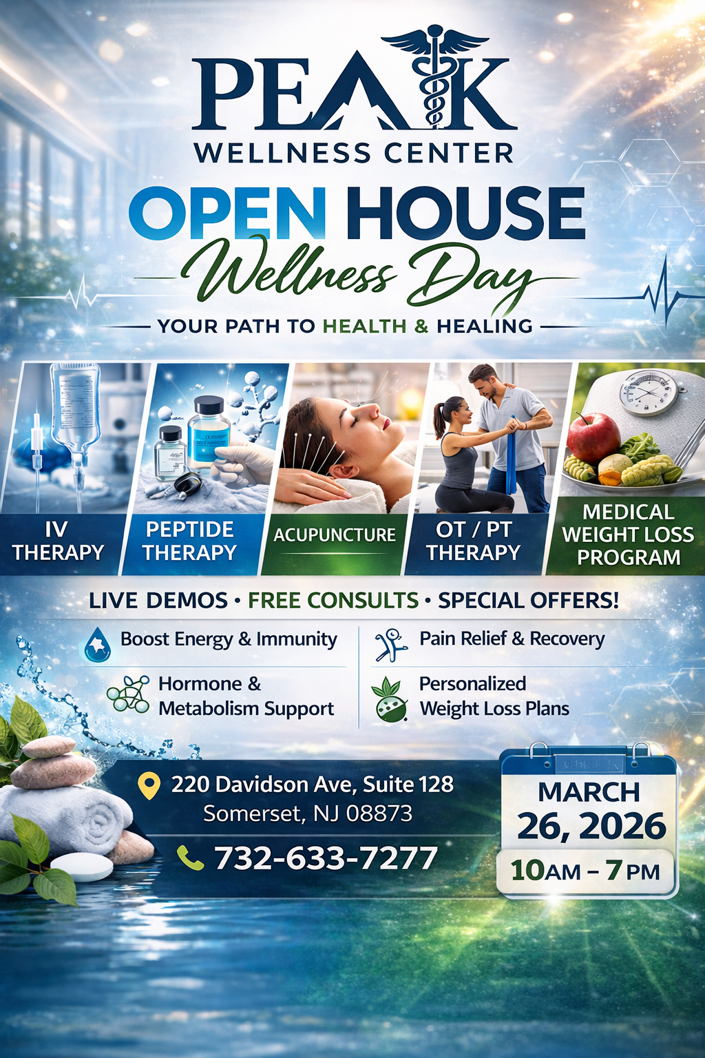 Join us at Peak Wellness Center for our Open House Wellness Day and explore the services designed to support your health, recovery, and longevity. From IV hydration and peptide therapy to acupuncture, occupational & physical therapy, and medically guided weight loss, our team will be offering information, consultations, and exclusive event specials. Come see how we’re helping Somerset feel stronger, healthier, and more energized — all under one roof!