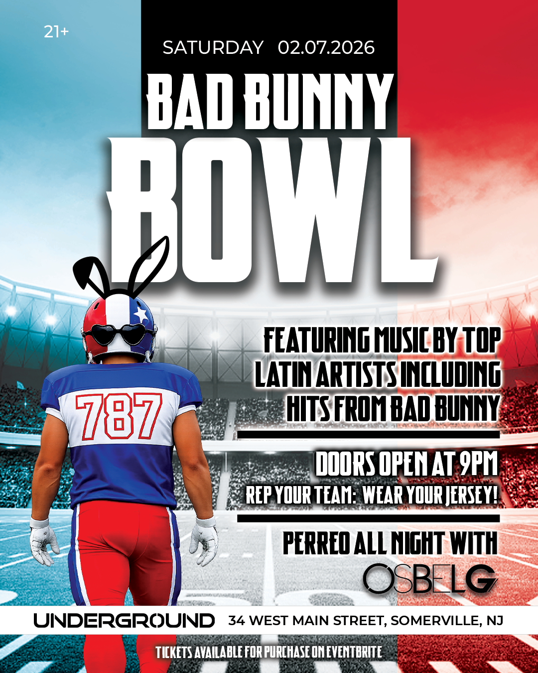 The Ultimate Pre-Party for the biggest game & halftime show of the year! Get ready to kick off the night at the Underground! Rep your team, rock your jersey and dance all night to the hottest Latin music, featuring tracks from the biggest Latin artists, including Bad Bunny and more.