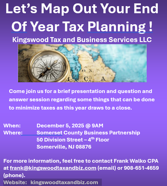 Come join us on Friday, December 5, 2025 at 9AM at the SCBP (50 Division St, Somerville, NJ 08876) for a quick review of some tax planning tips at year-end. Items to be discussed i(not all inclusive) : charitable contributions, capital gains, itemized vs standard deductions, understanding marginal tax rates, and education benefits.