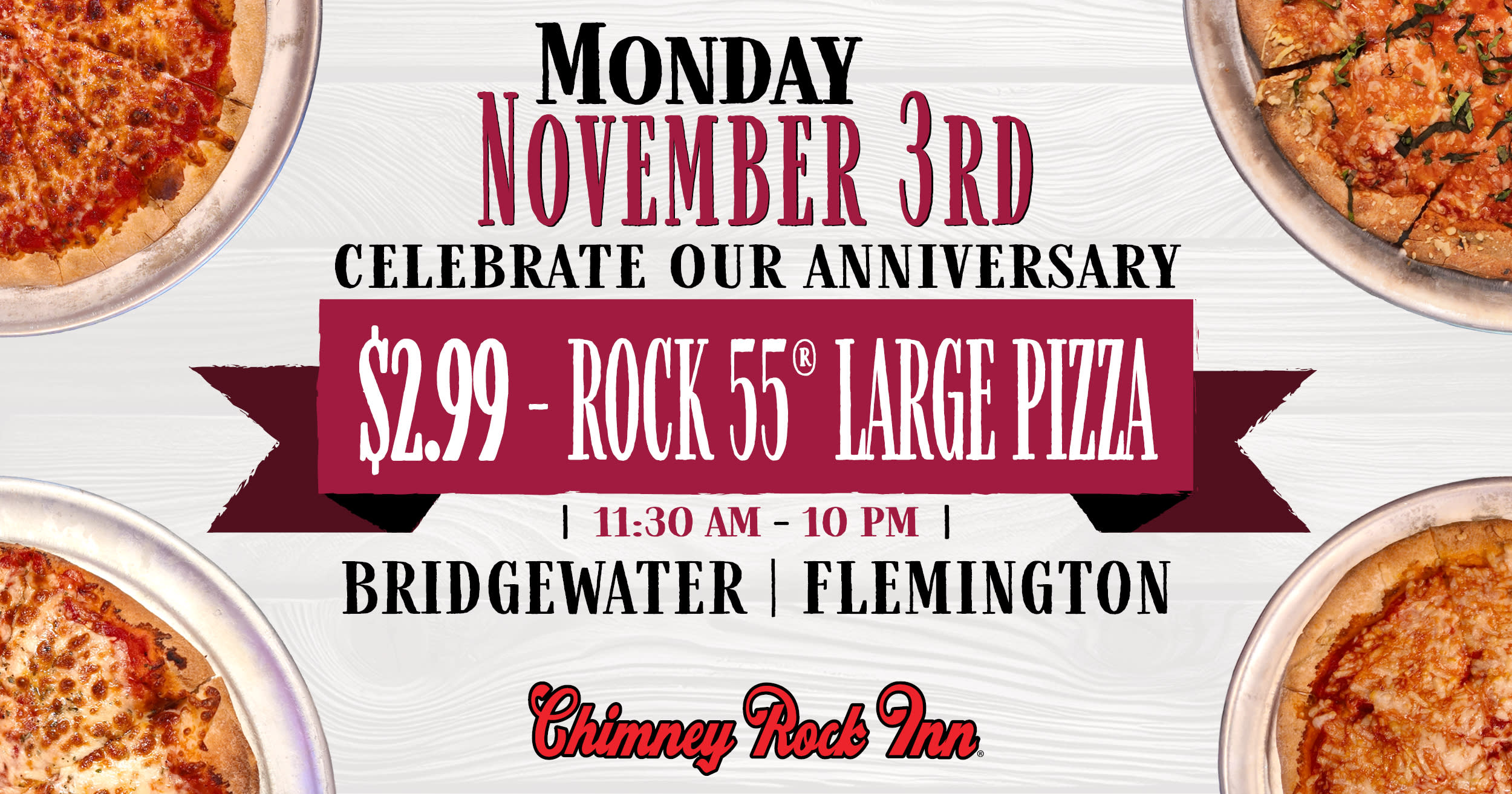 For one day only, guests can enjoy a large Rock 55® pizza for just $2.99 (dine-in only) at both the Bridgewater and Flemington locations. The tradition continues as a heartfelt thank-you to the loyal guests who have made Chimney Rock Inn a local landmark for generations.